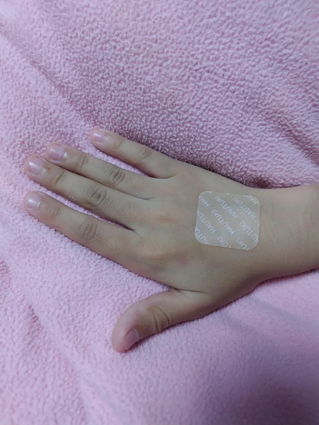 肘付近は、寝ている間に剥がれてしまったので、足の甲や手の甲に毎日交代で貼り付けています。これらは朝まで貼り付いてくれています。